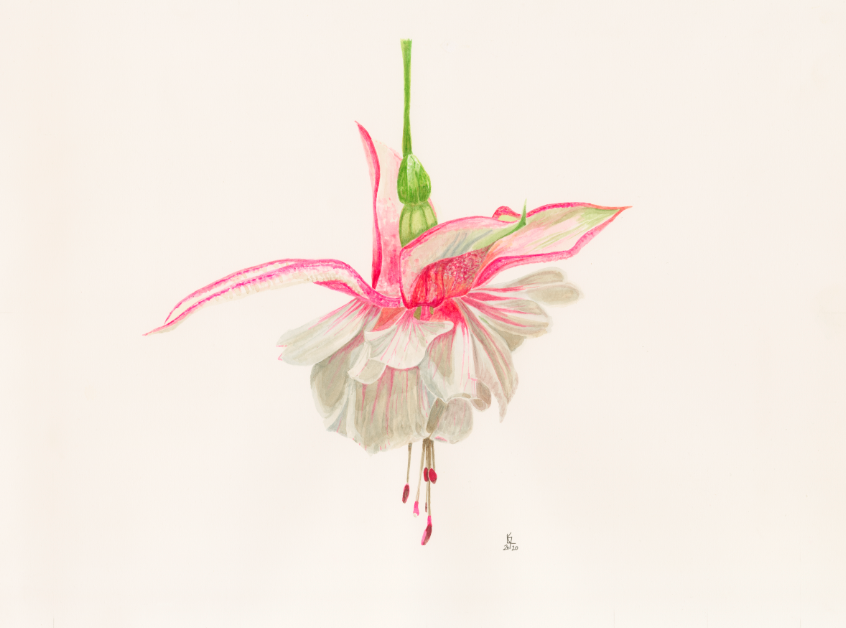 A pale fuchsia dances on the page. The library garden is so mild, it was in full bloom in January!