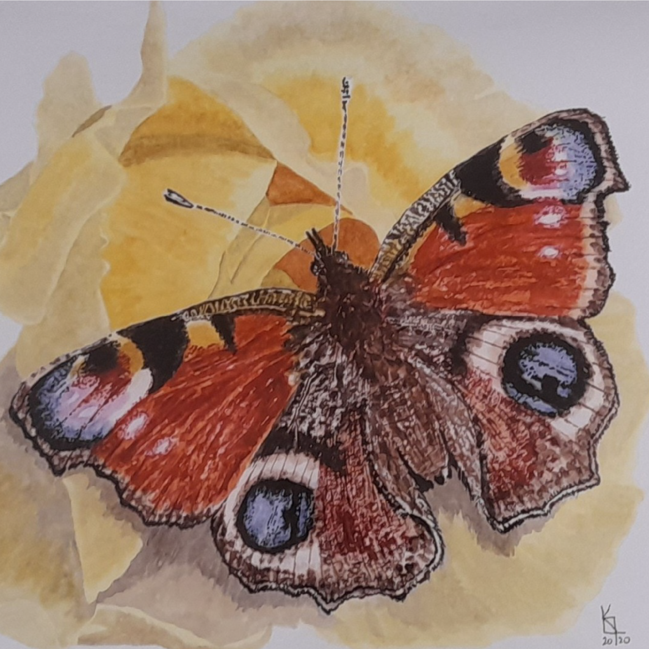 This peacock butterfly uses a warm colour palette of blue, red, yellow and rich brown tones, in extraordinary detail.